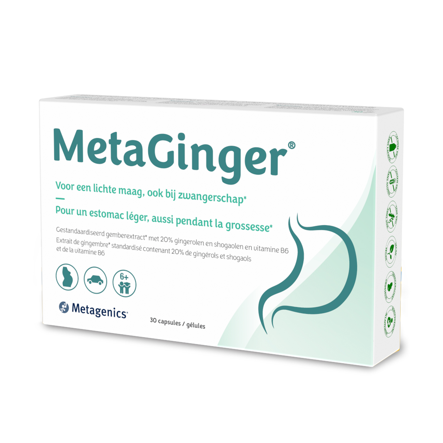 MetaGinger® contains a highly concentrated ginger extract that supports digestion*, for example while travelling. Moreover, ginger contributes to physical well-being during pregnancy*.