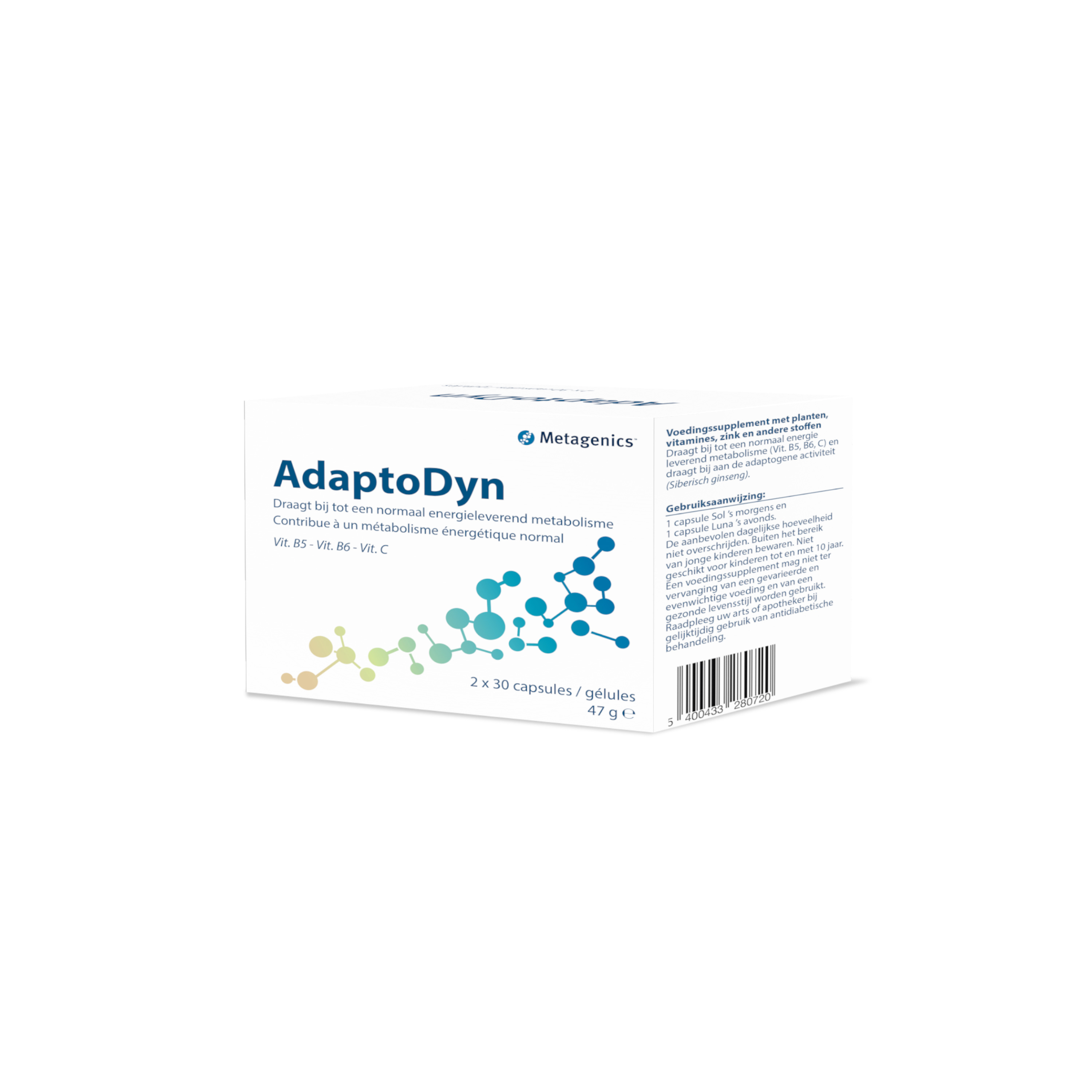 AdaptoDyn contains vitamin B5, B6 and C to support the energy level and Siberian Ginseng to support adaptogenic acitivity.