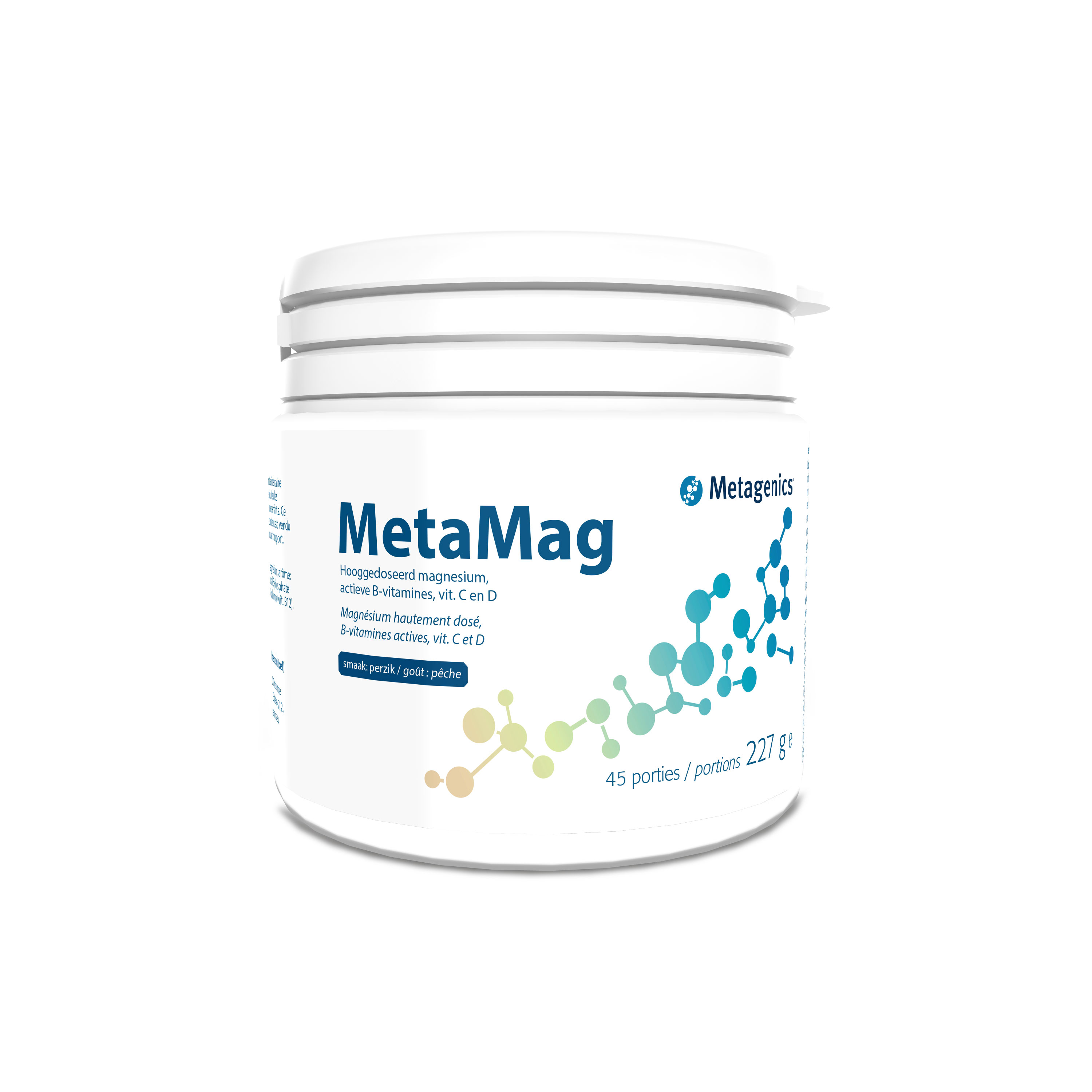 Magnesium bisglycinate, flavor: citric acid, magnesium glycerophosphate, flavor: peach flavor, taurine, vitamin C (L-ascorbic acid), sweetener: steviol glycosides from stevia, bulking agent: magnesium carbonate, vitamin D (cholecalciferol), vitamin B6 (pyridoxal-5-phosphate), bulking agents: dicalcium phosphate and silicon dioxide, folate (calcium-L-methylfolate), vitamin B12 (methylcobalamin)
