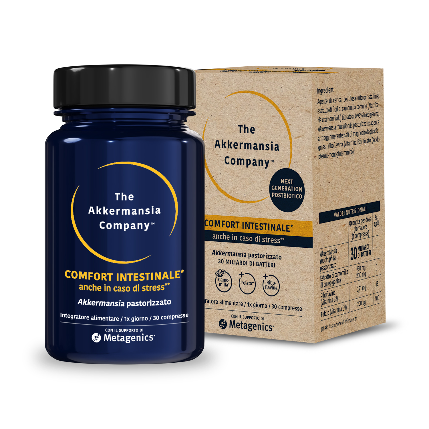 Vulstof: microkristallijne cellulose, dicalciumfosfaat, hydroxypropylmethylcellulose; gepasteuriseerde Akkermansia muciniphila MucT®, extract van gedroogde kamillebloem (Matricaria chamomilla L.) getitreerd in apigenine, antiklontermiddel: mono- en diglyceriden van vetzuren, magnesiumzouten van vetzuren, siliciumdioxide; stabilisator: carboxymethylcellulose; maïszetmeel, glansmiddel: hydroxypropylcellulose, polyethyleenglycol; foliumzuur (calcium-L-methylfolaat - vitamine B9), riboflavine (vitamine B2)